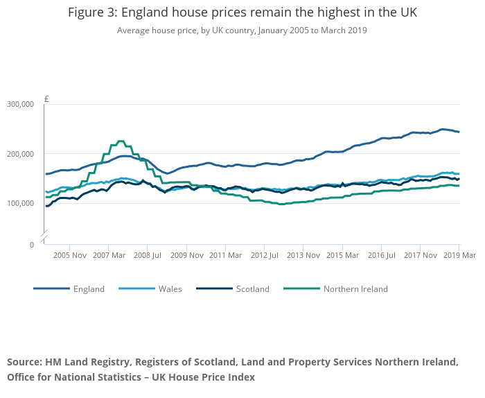 House price growth in Wales, increased by 3.0% in the year to March 2019, down from 3.6% in February 2019 with the average house price at £159,000. Northern Ireland house prices increased by 3.5% over the year to Quarter 1 (Jan to Mar) 2019. Northern Ireland remains the cheapest UK country to purchase a property in, with the average house price at £135,000 (Figure 3).