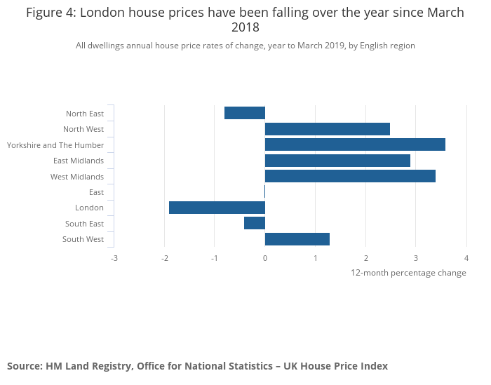 The lowest annual growth was in London, where prices fell by 1.9% over the year to March 2019, up from a fall of 2.7% in February 2019.