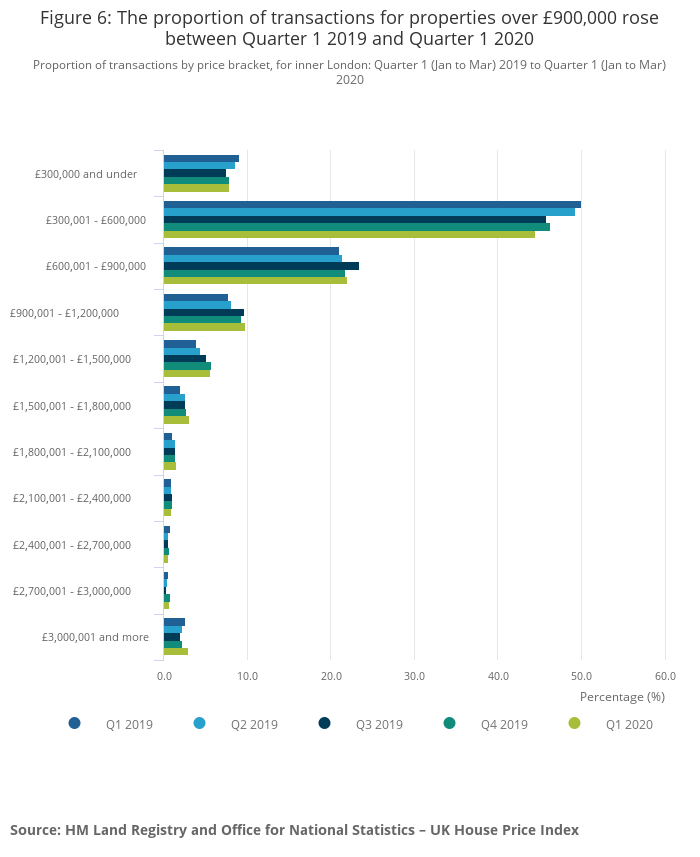 Image .csv .xlsBetween Quarter 1 2019 and Quarter 1 2020, in inner London the proportion of transactions of £600,000 and under decreased by 6.7 percentage points. Overall, 25.4% of transactions in Quarter 1 2020 were properties over £900,000. This is higher than in Quarter 1 2019, when around 19.7% of transactions were of properties over £900,000.