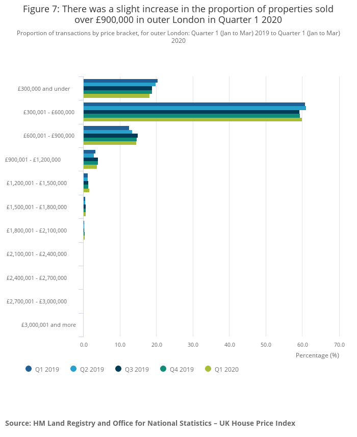Figure 7: There was a slight increase in the proportion of properties sold over £900,000 in outer London in Quarter 1 2020