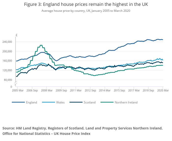 The average house price in Northern Ireland increased by 3.8% over the year to Quarter 1 (Jan to Mar) 2020. Northern Ireland remains the cheapest UK country to purchase a property in, with the average house price at £141,000 (Figure 3).