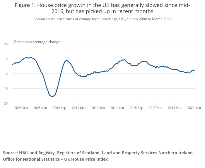 UK average house prices increased by 2.1% over the year to March 2020, up from 2.0% in February 2020.