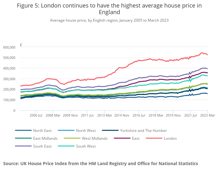 London’s average house prices remain the most expensive of any region in the UK, with an average price of £523,000 in March 2023.
