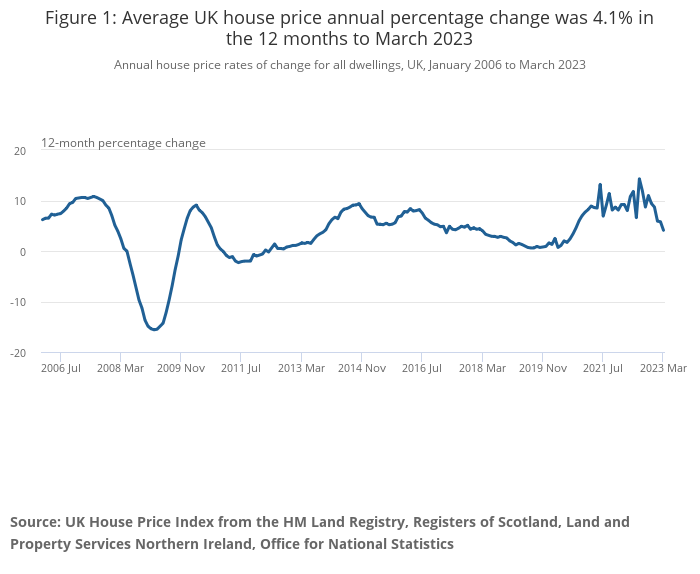 Average UK house prices increased by 4.1% in the 12 months to March 2023, down from 5.8% in February 2023.