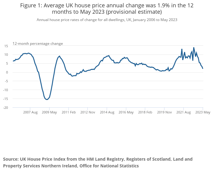 Average UK house prices increased by 1.9% in the 12 months to May 2023 (provisional estimate), down from a revised 3.2% in April 2023.