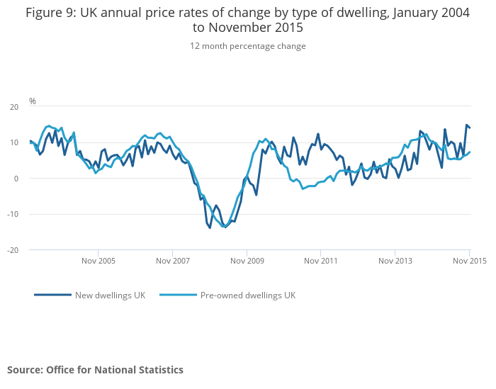During the year to November 2015, prices paid for new dwellings increased by 14.0% on average, compared with an increase of 14.8% in the year to October 2015 (Figure 9). The average UK house price for new dwellings in November 2015 was £294,000.
