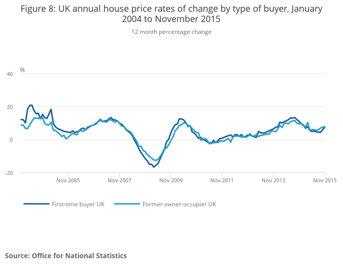 Figure 8: UK annual house price rates of change by type of buyer, January 2004 to November 2015