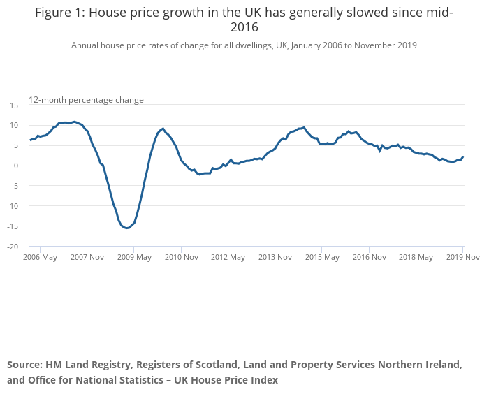 UK average house prices increased by 2.2% over the year to November 2019, up from 1.3% in October 2019.