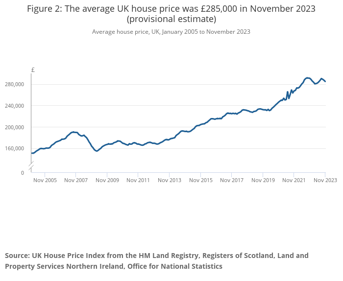 The average UK house price was £285,000 in November 2023, which was £6,000 lower than 12 months ago.