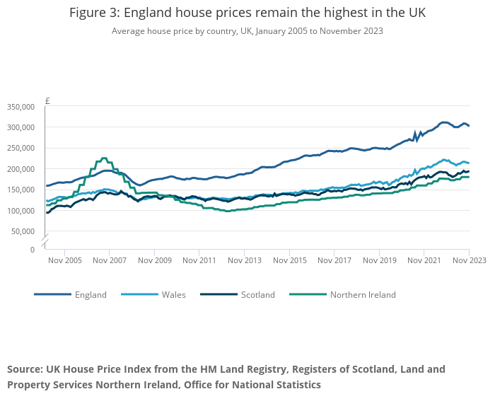 Average house prices over the 12 months to November 2023 decreased in England to £302,000 (negative 2.9%), decreased in Wales to £213,000 (negative 2.4%), but increased in Scotland to £194,000 (2.2%).