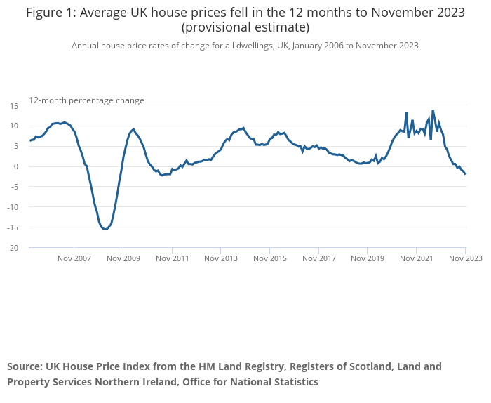 The latest UK House Price Index data published on GOV.UK by HM Land Registry (HMLR) for November 2023 show that average UK house price annual inflation was negative 2.1% (provisional estimate) in the 12 months to November 2023. This was down from the revised estimate of negative 1.3% in the 12 months to October 2023 and is the largest annual fall since 2011.