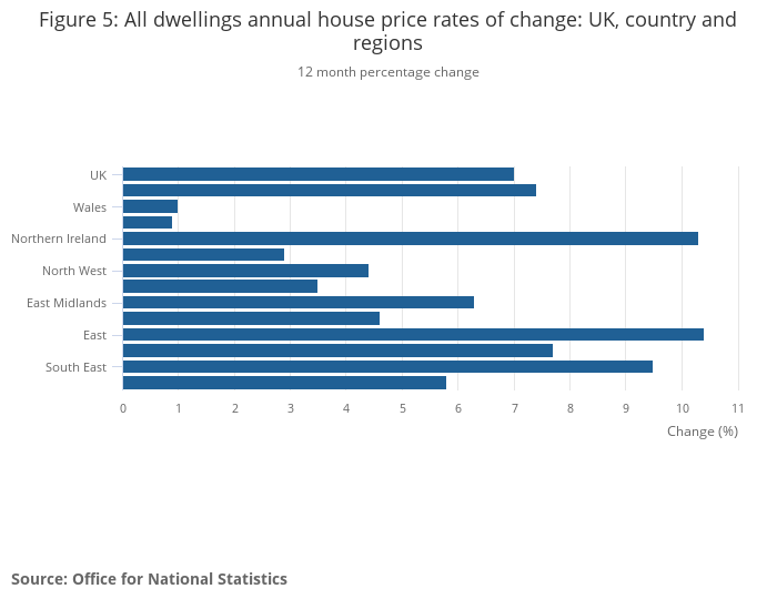 - Annual house price increases in England were driven by an annual increase in the East (10.4%) and the South East (9.5%).