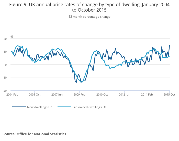 During the year to October 2015, prices paid for new dwellings increased by 14.8% on average, compared with an increase of 6.3% in the year to September 2015 (Figure 9). The average UK house price for new dwellings in October 2015 was £286,000.