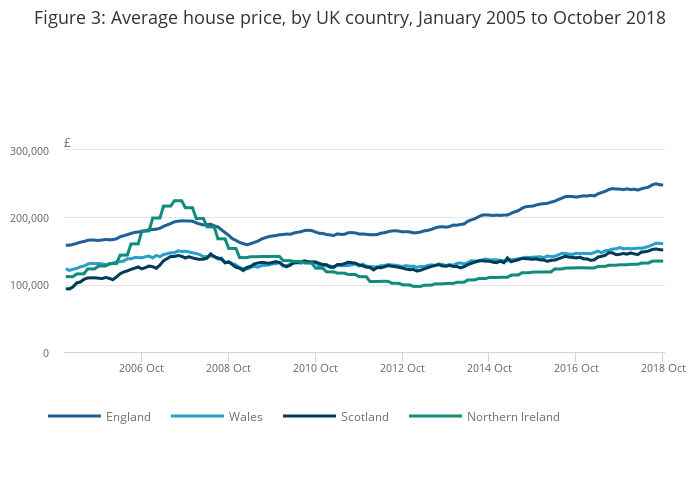 Figure 3: Average house price, by UK country, January 2005 to October 2018