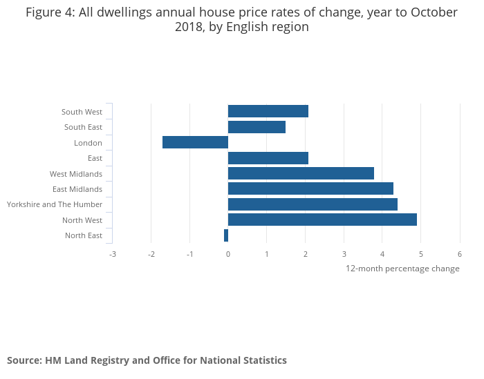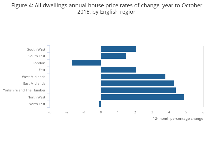 The lowest annual growth was in London, where prices fell by 1.7% over the year to October 2018, up from a fall of 1.8% in the year to September 2018.