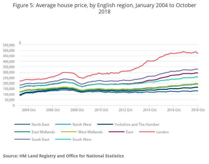 Download this chart Figure 5: Average house price, by English region, January 2004 to October 2018