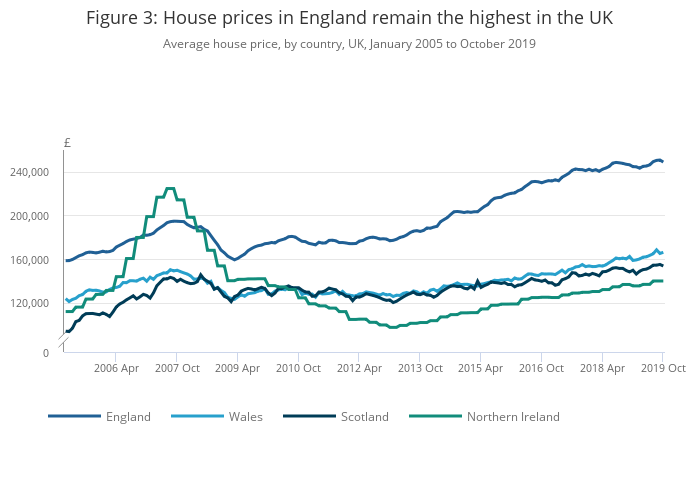 Average house prices increased over the year in England, to £249,000 (0.5%); in Wales, to £166,000 (3.3%); in Scotland, to £154,000 (1.4%); and in Northern Ireland, to £140,000 (4.0%).