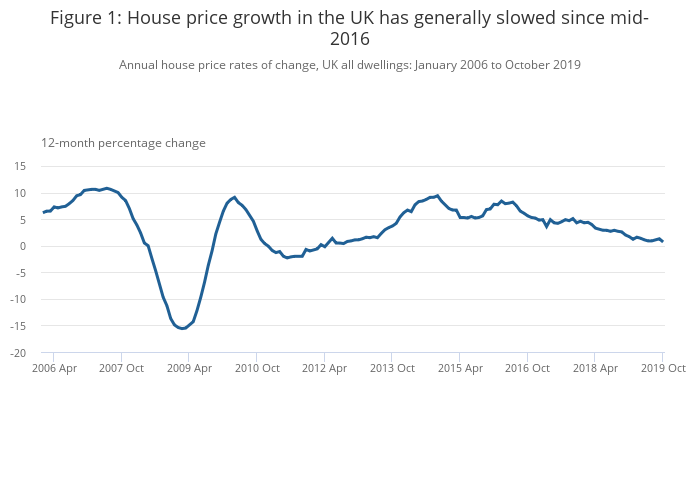 UK average house prices increased by 0.7% over the year to October 2019 to £233,000; this is the lowest growth since September 2012.
