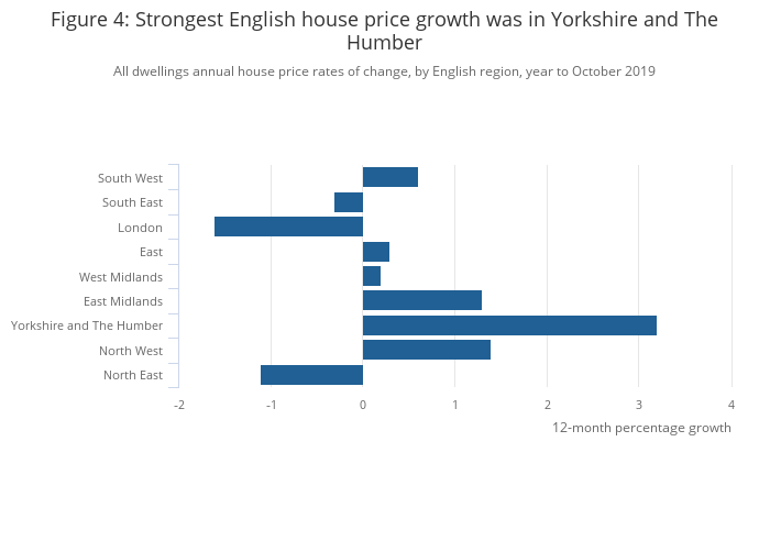 Image .csv .xlsAt a regional level, Yorkshire and the Humber was the English region with the highest annual house price growth, with prices increasing by 3.2% in the year to October 2019 (Figure 4). This was followed by the North West, increasing by 1.4%.
