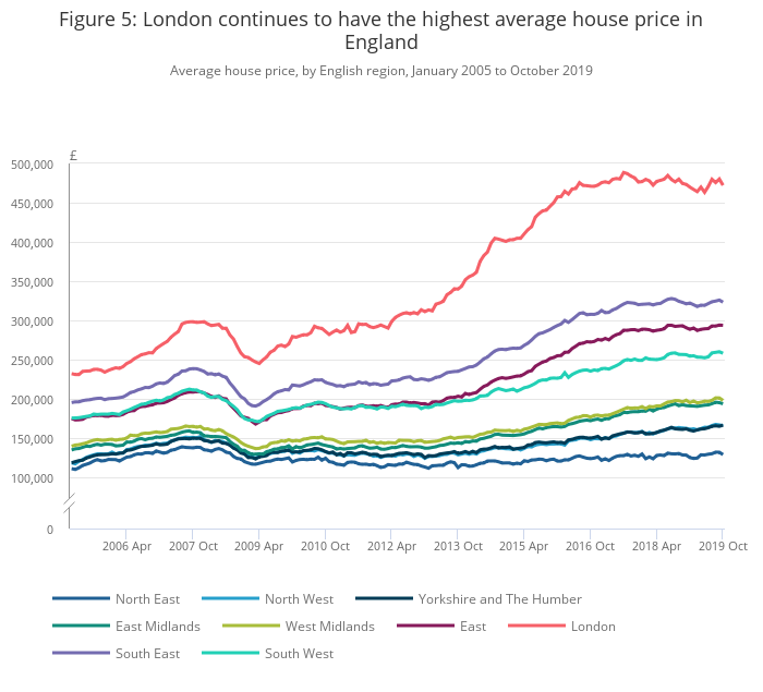 The lowest annual growth was in London, where prices fell by 1.6% over the year to October 2019, down from 0.8% in September 2019. This was followed by the North East, where prices fell by 1.1% over the year.