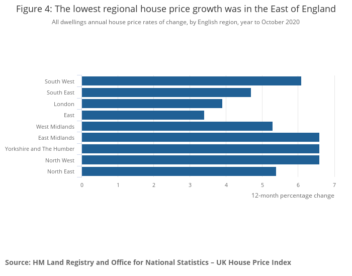 The lowest annual growth was in the East of England, where average prices increased by 3.4% over the year to October 2020.