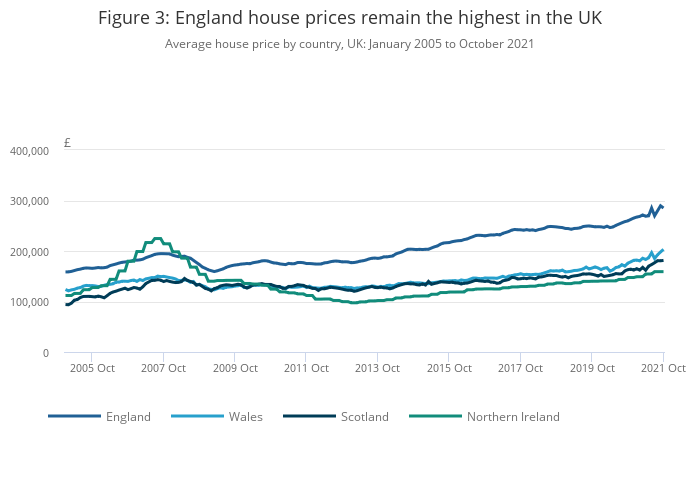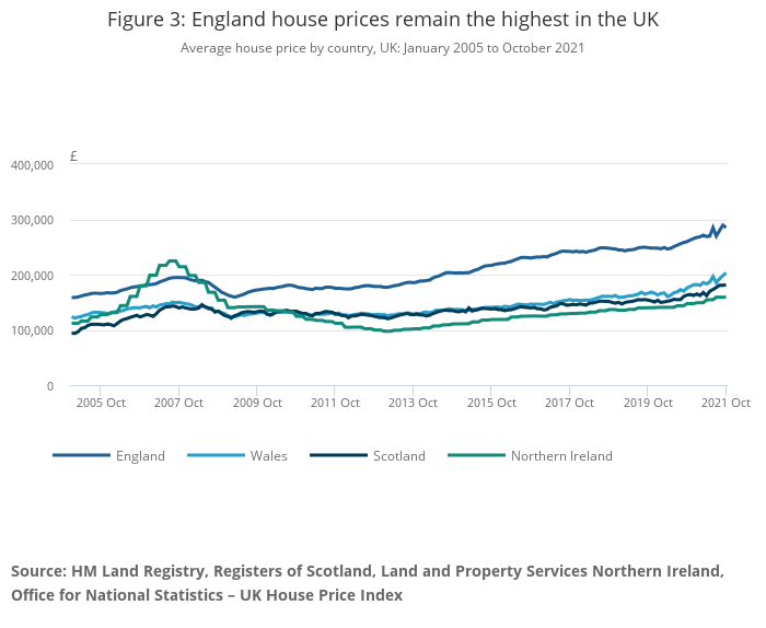 Average house prices increased over the year in England to £285,000 (9.8%), in Wales to £203,000 (15.5%), in Scotland to £181,000 (11.3%) and in Northern Ireland to £159,000 (10.7%).