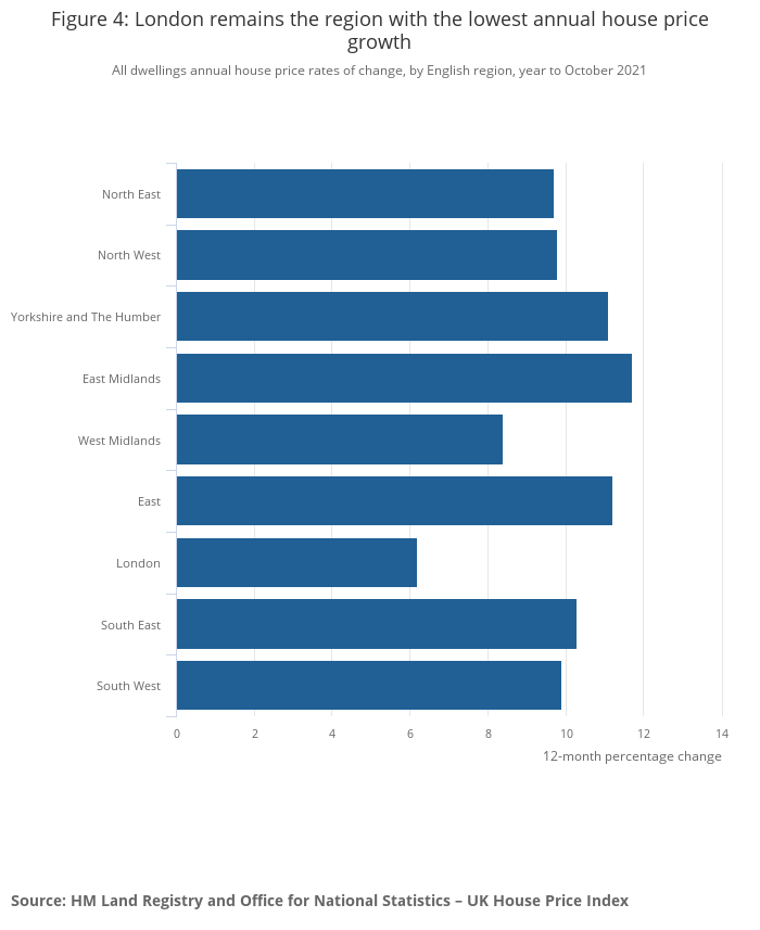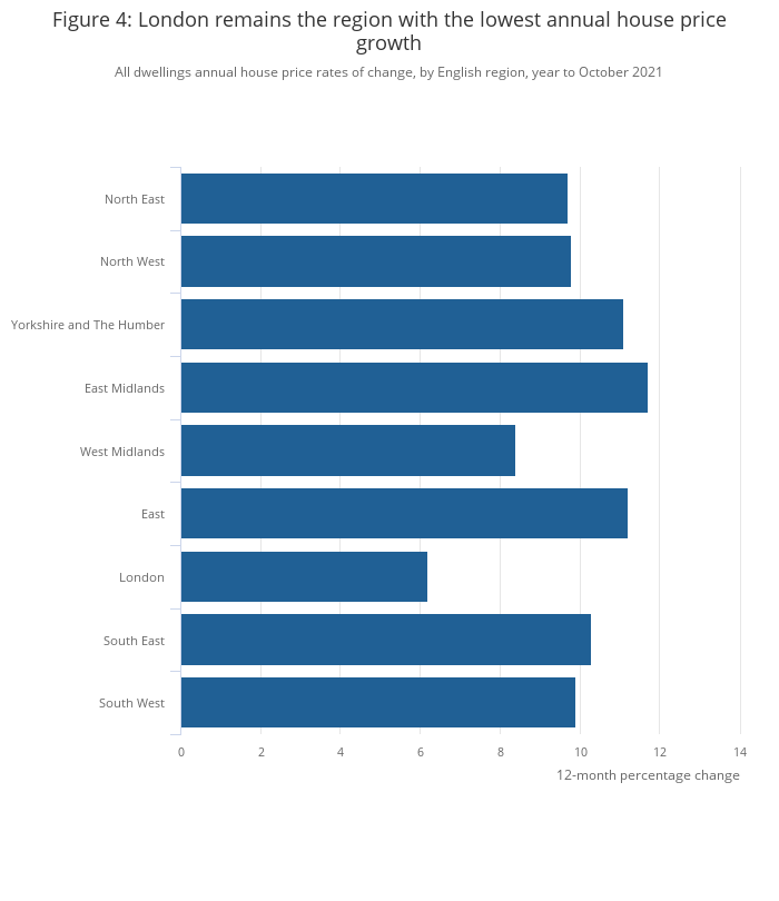 The lowest annual house price growth was in London, where average prices increased by 6.2% over the year to October 2021, up from 2.8% in September 2021.