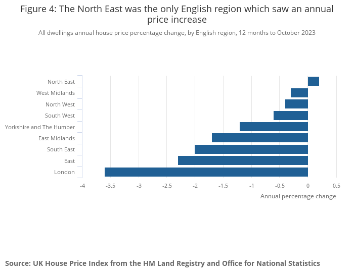 The North East was the only English region which saw an increase in average house prices in the 12 months to October 2023 (0.2%), while London saw the largest fall (negative 3.6%).