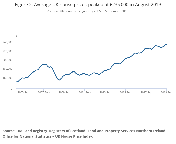 Figure 2: Average UK house prices peaked at £235,000 in August 2019
