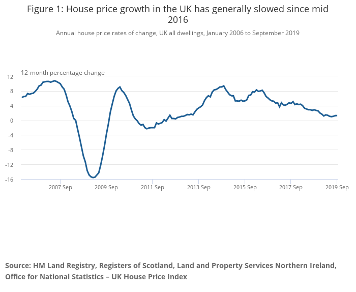 Average house prices in the UK increased by 1.3% in the year to September 2019, unchanged from August 2019 (Figure 1). Over the past three years, there has been a general slowdown in UK house price growth, driven mainly by a slowdown in the south and east of England.