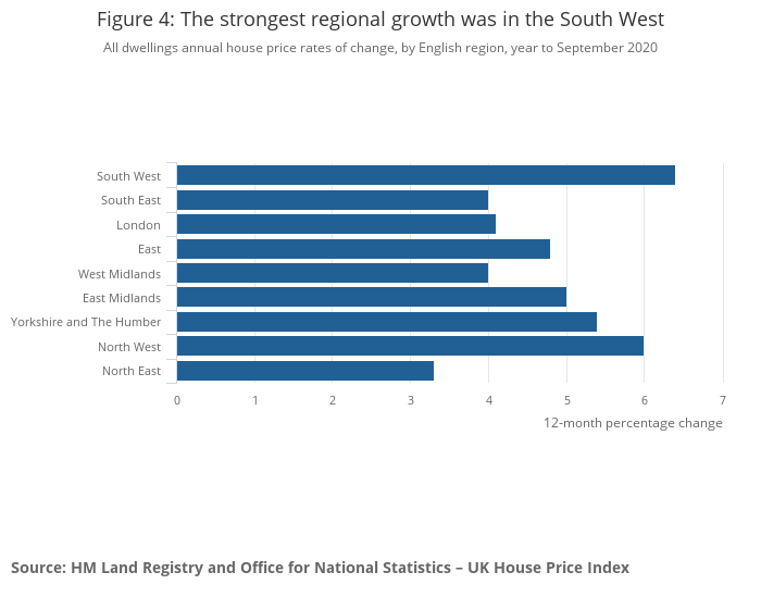 Image .csv .xlsThe South West was the English region with the highest annual house price growth, with average prices increasing by 6.4% to £275,000 in the year to September 2020, up from 3.2% in August 2020 (Figure 4).