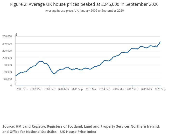 UK average house prices increased by 4.7% over the year to September 2020, up from 3.0% in August 2020, to stand at a record high of £245,000.