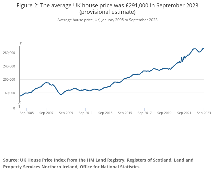 - The average UK house price was £291,000 in September 2023, which was little changed from 12 months ago but above the recent low in March 2023.