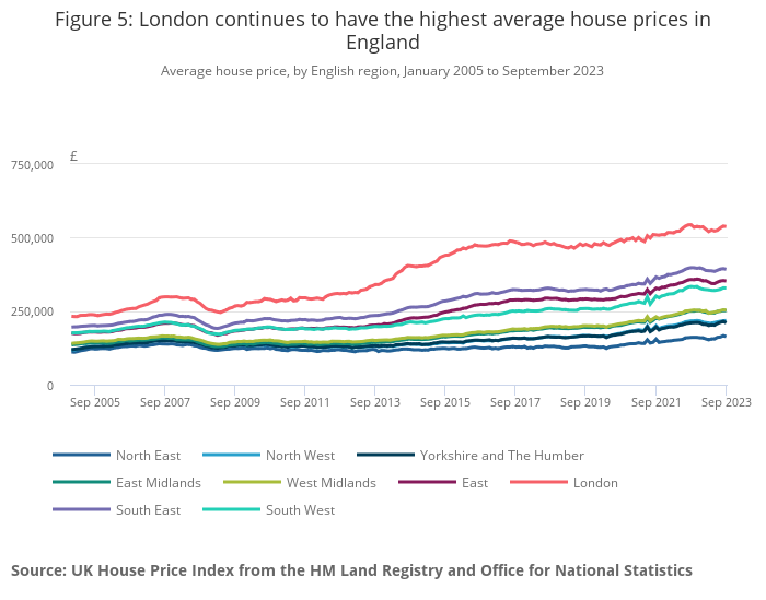 Image .csv .xlsLondon's average house prices remain the most expensive of any region in the UK, with an average price of £537,000 in September 2023 and an annual inflation rate of negative 1.1% in the 12 months to September 2023. London’s annual inflation slowed in September 2023 because London prices decreased (negative 0.3%) between August and September 2023, while prices increased between the same months last year.