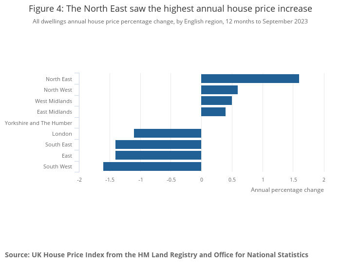 The North East is also the region with the highest annual house price inflation, with average prices increasing by 1.6% in the 12 months to September 2023, down from an annual inflation rate of 4.5% in August 2023.