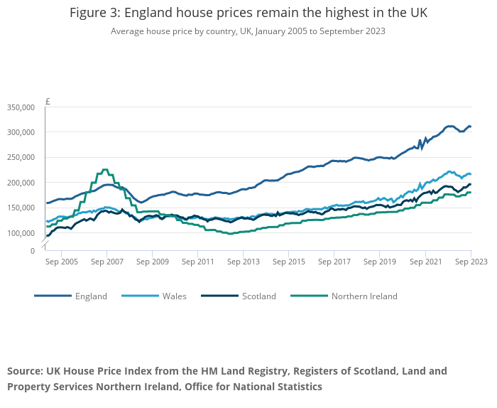 - Average house prices over the 12 months to September 2023 decreased in England to £310,000 (negative 0.5%), decreased in Wales to £215,000 (negative 2.7%), but increased in Scotland to £195,000 (2.5%).