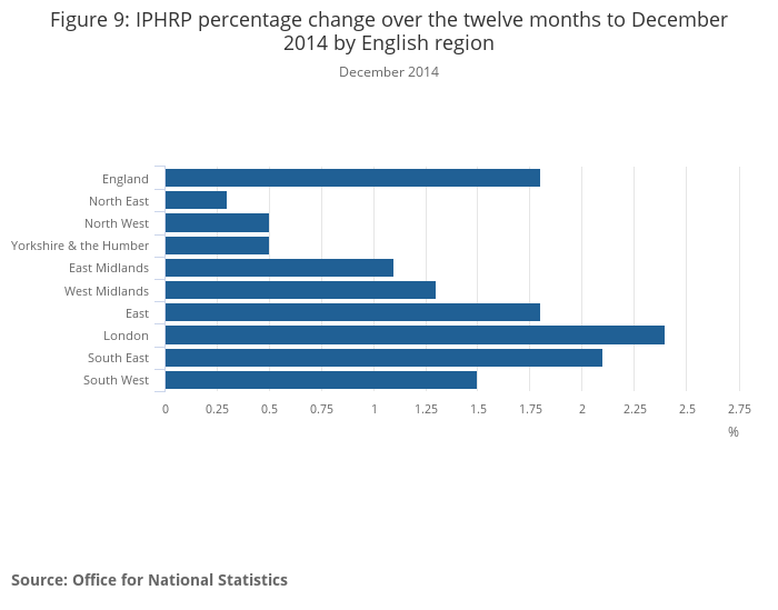 Download this chart Figure 9: IPHRP percentage change over the twelve months to December 2014 by English region