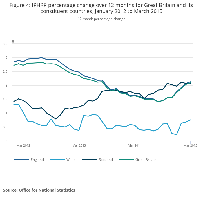 Figure 4: IPHRP percentage change over 12 months for Great Britain and its constituent countries, January 2012 to March 2015