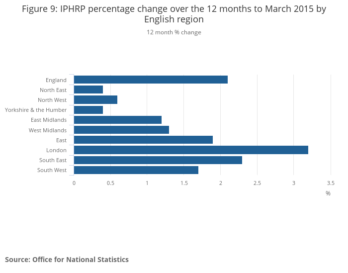 Download this chart Figure 9: IPHRP percentage change over the 12 months to March 2015 by English region