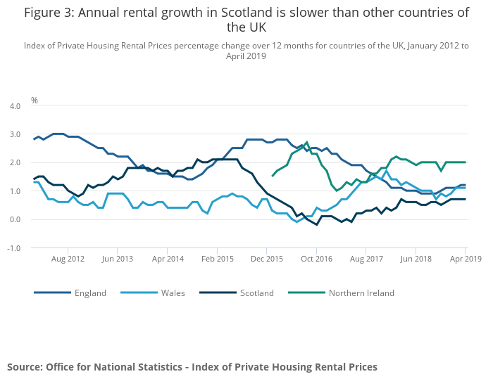Rental growth in Scotland increased by 0.7% in the 12 months to April 2019, unchanged since January 2019. The weaker growth in Scotland since 2016 may be due to stronger supply and weaker demand in Scotland, as reported by the Association of Residential Letting Agents (ARLA).