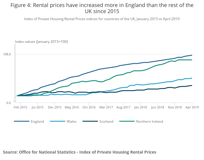 In England, private rental prices grew by 1.2%, Wales experienced growth of 1.1%, while in Scotland private rental prices increased by 0.7% in the 12 months to April 2019.