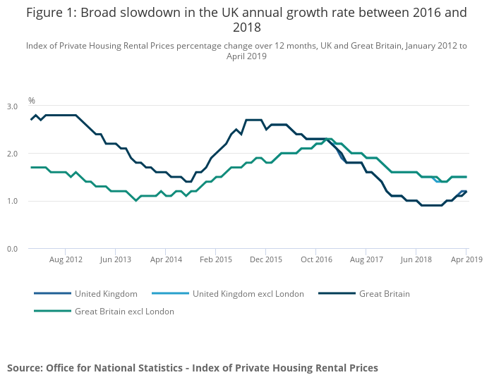 Private rental prices paid by tenants in the UK rose by 1.2% in the 12 months to April 2019, unchanged from March 2019.