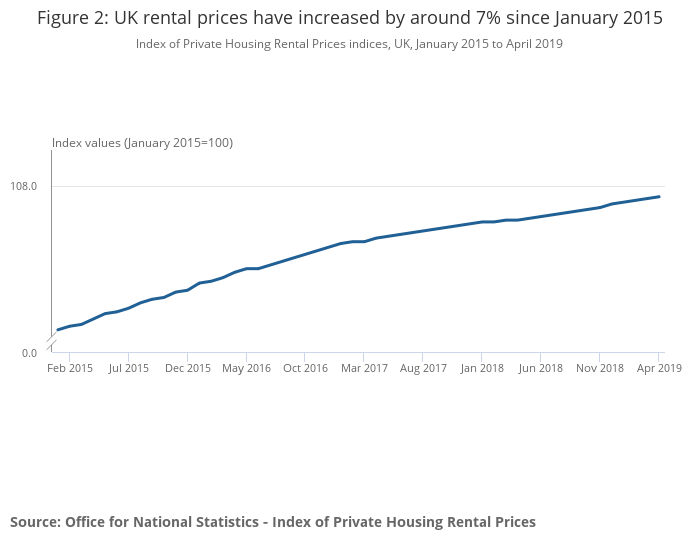Rental prices for the UK excluding London increased by 1.5% in the 12 months to April 2019, unchanged from March 2019 (Figure 1). London private rental prices increased by 0.5% in the 12 months to April 2019, unchanged from 0.5% in March 2019.