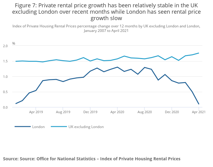 In the 12 months to April 2021, rental prices for the UK excluding London increased by 1.8%, up from an increase of 1.7% in March 2021 (Figure 1). London private rental prices increased by 0.1% in the 12 months to April 2021, down from 0.5% in March 2021.