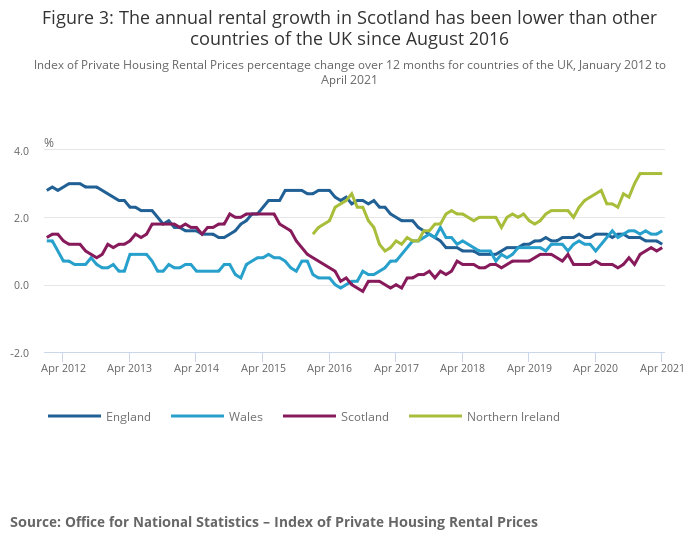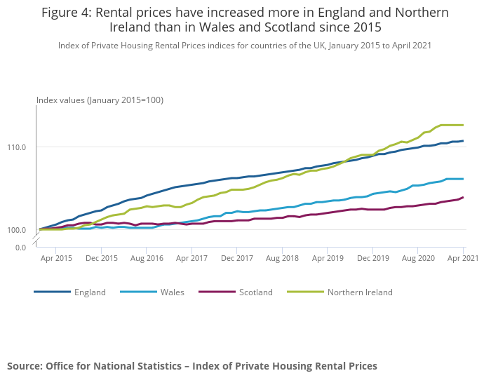 Private rental prices grew by 1.2% in England, 1.6% in Wales and 1.1% in Scotland in the 12 months to April 2021.