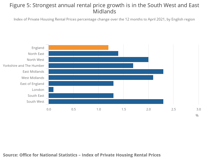 The lowest annual rental price growth was in London where rental prices increased by 0.1% in the 12 months to April 2021. This was followed by the East of England and the South East, both at 1.3%.