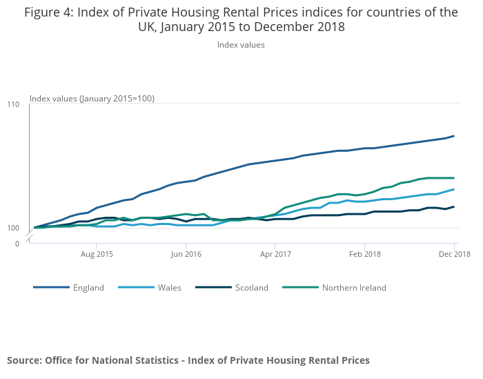 In England, private rental prices grew by 1.1%, Wales experienced growth of 0.8%, while in Scotland private rental prices increased by 0.6% in the 12 months to December 2018.