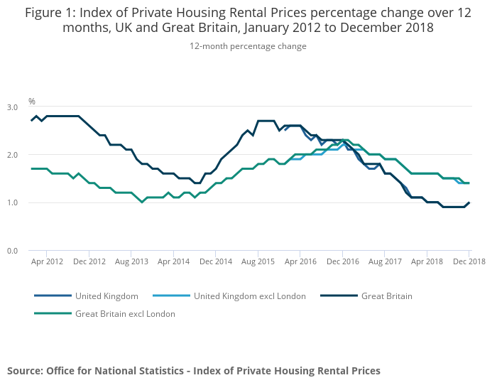Rental prices for the UK excluding London increased by 1.4% in the 12 months to December 2018, unchanged from November 2018 (Figure 1). London private rental prices increased by 0.2% in the 12 months to December 2018; up from being unchanged (0.0%) in November 2018.