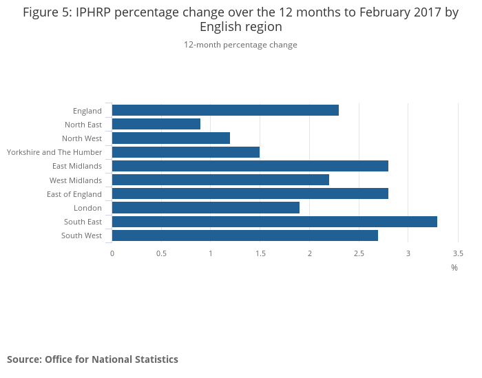 Download this chart Figure 5: IPHRP percentage change over the 12 months to February 2017 by English region