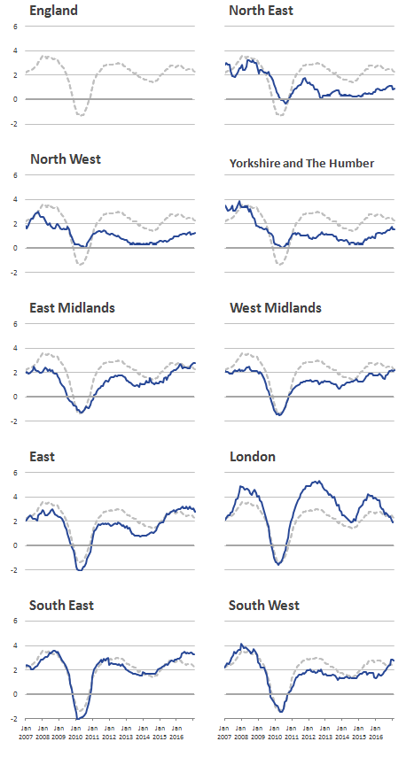Figure 6: IPHRP percentage change over 12 months by English region, January 2007 to February 2017